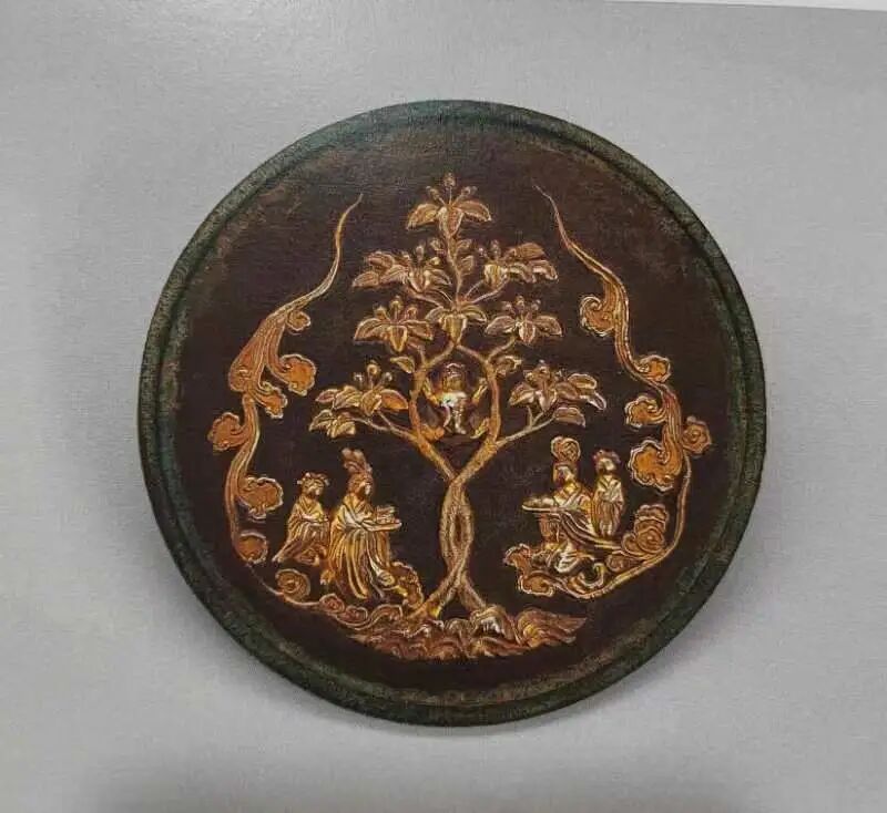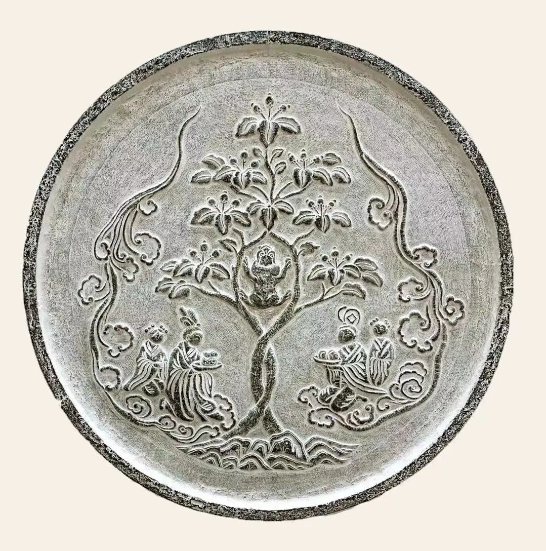 余好友黄将军收藏古镜数百方,多为精妙绝伦图案精奇罕见者。其中一方唐镜图案如下: