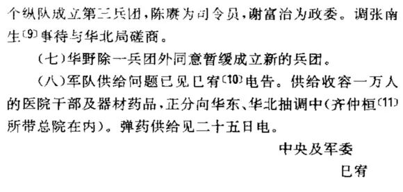 可注意的是关于中原解放军之建制,中央决定设立四个兵团,包括原华野(华东野战军)部分兵力及原中野兵力共计四个兵团。