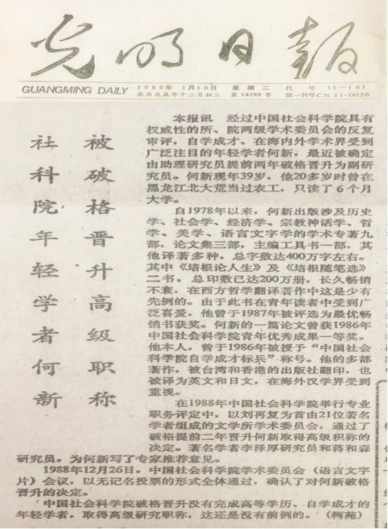 何新是自学成才的学者,1977年考入大庆师范学院,1978年退学,理由是他认为学院的教学水平太低,自己没必要在那里读书。1979年他回到北京,旋即进入中央财政金融学院任教师。1980年,何新被破格调入中国社会科学院。凭着丰富的学术成果、过硬的学术水平,1985年何新被中国社科院聘任助理研究员。1988年又破格晋升副研究员,人民日报1989年1月23日还专门发文《在专业职务评定中尽量排除非学术因素,中国社科院破格晋升一批中青年学者》,进行报道。1991年何新再晋升研究员。一个大学肄业生,没有高等学历而被作为国家最高学术机构的中国社科院评定高级职称,这也是史无前例的。