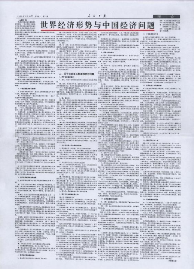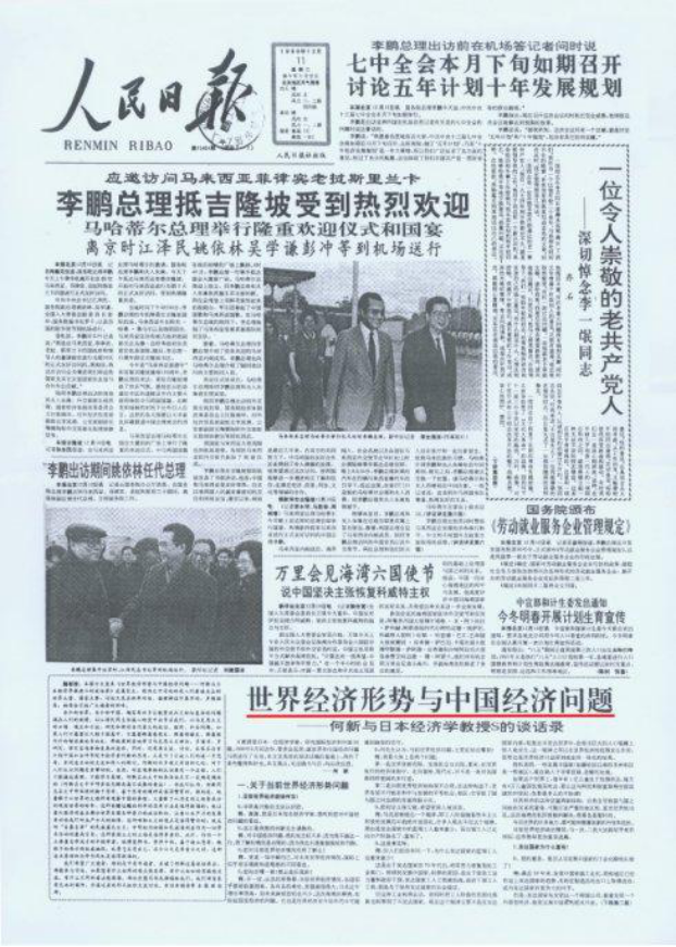 《人民日报》在1990年12月11日从一版开始,接转二版、三版,用二又四分之一的版面发表了何新撰写的《世界经济形势与中国经济问题——何新与日本经济学教授S的谈话录》,北京周报以四十种文字全文翻译转发全世界。这篇谈话录,视野宏大,议论深刻,提出了很多惊世骇俗、颠覆时流的观点。比如,提出中国生产过剩论,认为中国经济的问题不在于发展不够快、生产力不足,而正好是因为中国发展过急过快、工业产能已经出现过剩,超出了国内市场的容量,是市场不足导致的问题;因此中国人没有必要对自己的发展水平妄自菲薄,而正应该有足够的自信,去面向国际市场,进行全球开拓,从而获得更大的发展空间和前景。当时,国内外对中国经济一片看衰,何新此文一出,可以说让国人眼前一亮、豁然开朗、信心大涨,一时间洛阳纸贵。