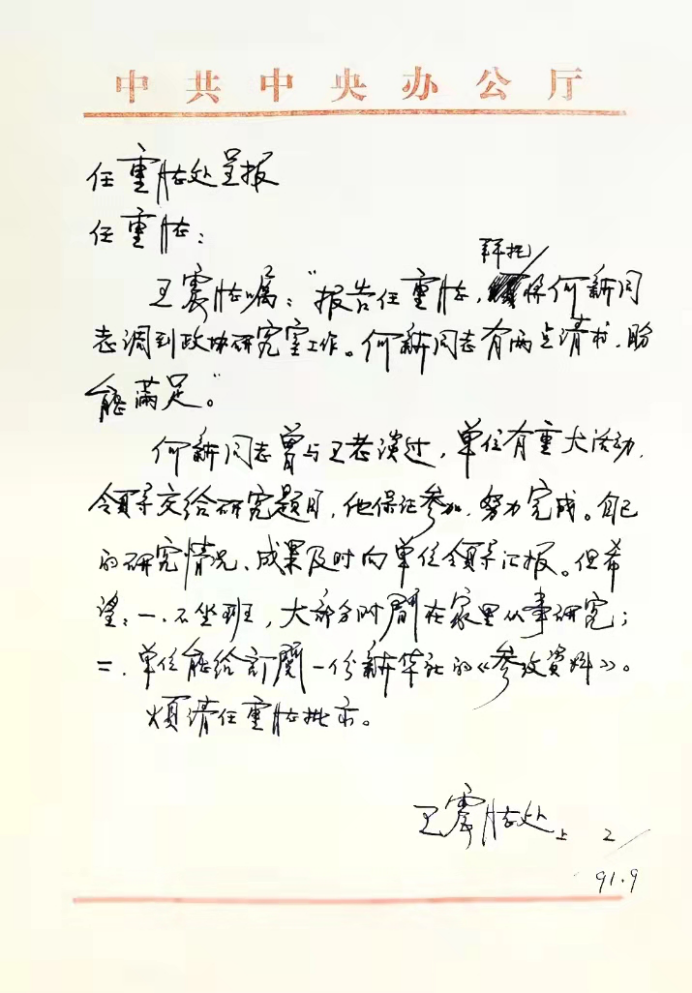 1988年后,由于何新的一系列建言献策得到中央关注,1991年夏时任总理李鹏欲调他去国务院发展研究中心工作。他表示去国务院系统工作很高兴很荣幸,但是我在社科院是不坐班的,希望仍然如此。这是给政府出了一道难题。后来,时任国家副主席王震又约他谈。他表示,自己不想当干部,不想从政,不想进步,不想入党,只想研究自己所感兴趣的学术和问题。最后,在王震的亲自协调下,何新调入全国政协(王任重时任全国政协常务副主席),成为领导特批可不上班的全国政协委员。此后,除了每年参加两会,作为国家高级公职人员,何新竟得以三十年没有上过一天班,一直到退休。这样的国家高级公职人员也是史无前例的。
