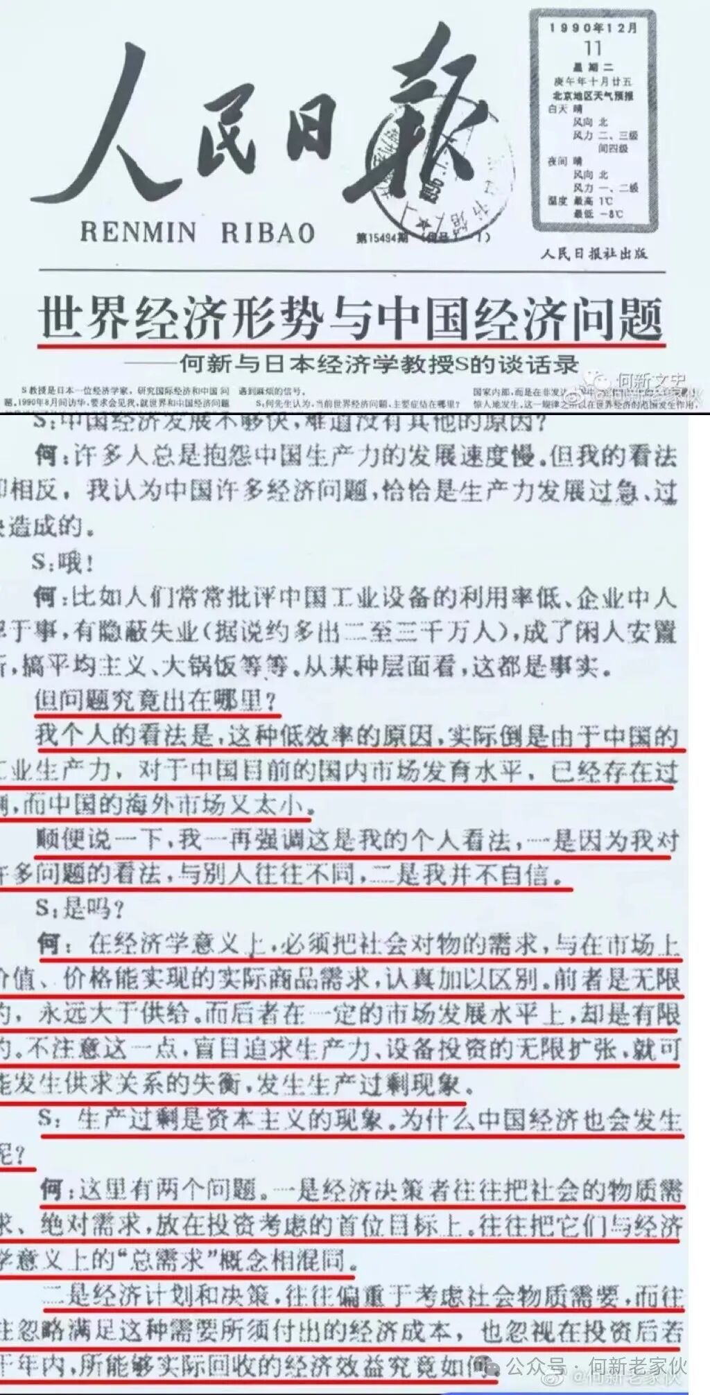 【一则剪报,一段记忆】(2019-07-23) 文后的图片,是1990年12月11日人民日报于第一版发表我的一篇长篇文章的截图。 在此文中,我破天荒地斗胆提出一个逆天之论。 80年代的国内主流经济学理论,均信奉匈牙利科尔内的短缺经济学,认为中国亦属于“短缺经济”,认为物价上涨原因是商品“供不应求”,即所谓“总需求大于总供给”。 这个观点自1988年以来一直写入国务院历年的政府工作报告。是普遍共识。 但是我在1988、1989两年,为研究通货膨胀问题而研究了财政部的有关经济报表。我发现许多企业之所以发生资金周转困难,还债难,三角债等问题,是由于生产的产品卖不出去,库存积压连年上升。 当时的主流经济学家都把这种现象看作个别性问题,即所谓结构问题,产销不对路问题云尔。 但我则意识到,这其实是个普遍性问题,产品积压导致流动性困难和债务连锁,就是古典经济学和马克思经济学所说——由于生产过剩,导致市场不足而引爆金融危机的问题。 此问题的解决之道,一是必须控制投资,减少过剩生产力,二是必须开拓新市场。 于是我借在人民日报发表的这篇文章,公开发表了这种独特的新认知。 然而此论出后,可以想象,在经济学界引起了轩然大波。一时间我似乎成为了公敌,几乎所有的经济学家都嘲骂何新胡说八道,没有资格乱说,完全不懂经济基本常识! 但是,1991年1月、5月及9月,国务院领导李总曾经数次约谈我,我得以面陈关于过剩问题之理论及各国经验。 我遂斗胆而言:当前经济问题,我认为并非总需求大于总供给,而是恰恰相反,可能是生产过剩及产能过剩——供给大于需求。(当时人们都认为,中国是个穷国,此论实在逆天。) 所以我建议:须抑制投资过剩,加速资金融通及回笼,大力开拓海外市场云云。 李总闻之,并不为我的逆见所忤,始终虚怀若谷,和颜悦色,认真听取,且不时有所摘记。 当时我仅是新进的一名政协委员,入政协前原职务是中国社会科学院文学所的研究员。在经济学方面,我纯粹属于一个非专业的”民科”(民间科学家)。且至今亦然。 我的有关谬见亦于内刊刊登。其后,得到陈云、宋平等高层领导的关注,或派员聆听或亲自召见。 此后一些有关理论及建议乃被国务院所采纳,政府工作报告不再提什么“总需求大于总供给”。 有关限产压库,鼓励出口,抑制过剩产能,鼓励开拓海外市场等一系列新政策相继出台,几年以后,收效显著,经济乃渐次摆脱困境。特别是加入WTO以后,中国经济扩张为外向型经济,中国快速走上了富裕强大之路。 回顾往事,此乃余平生经济学研究中最重要之经历,以个人之独见抗衡国内外主流经济学界,而竟披靡、折冲之。 但是,此实非个人之能。如果没有卓越领导人的真知锐见,破格用人,从善如流,则以我一介布衣,人微言轻,不过渺如微粟,又何有丝毫之能为也? 今日老而重病,神疲目衰,多病缠身,百无一能。回首前尘往事,不禁苍凉而怃然,倍加感思而怀念矣!
