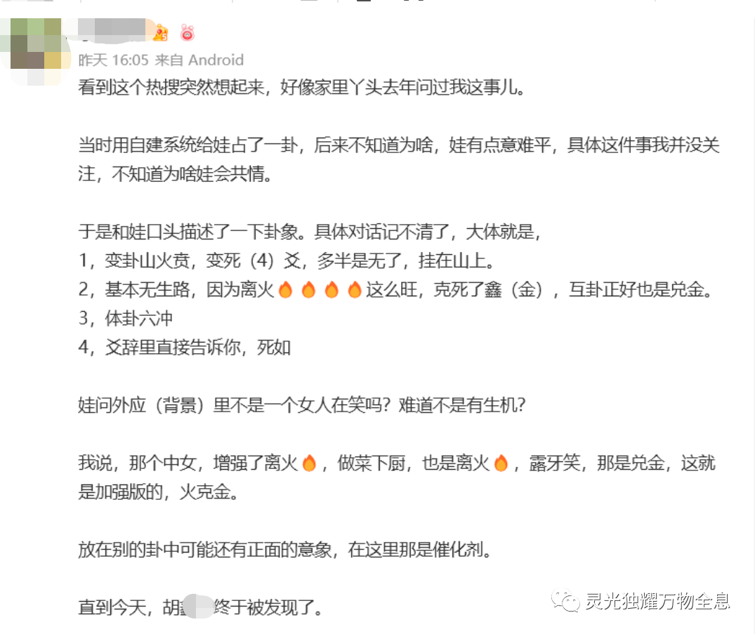 那么什么时候这个年干会应凶,拿掉命主的亥水呢?丙午大运时期没事,午合绊亥;2020年起进入乙巳运,这个巳冲亥,年柱就要动了,要去干掉辛金,2020庚子年进入乙巳运,没动,2021辛丑年,亥也不动,2022壬寅年,壬合丁、寅合亥,天干地支都动,就在2022壬寅年中应凶;公开信息可知是报道失踪于庚戌月,但查干支作用,其实在上个月己酉月期间,已经被瞄准;悬而不解三个月,癸丑月被公开报道吊死,癸冲丁、丑墓辛金