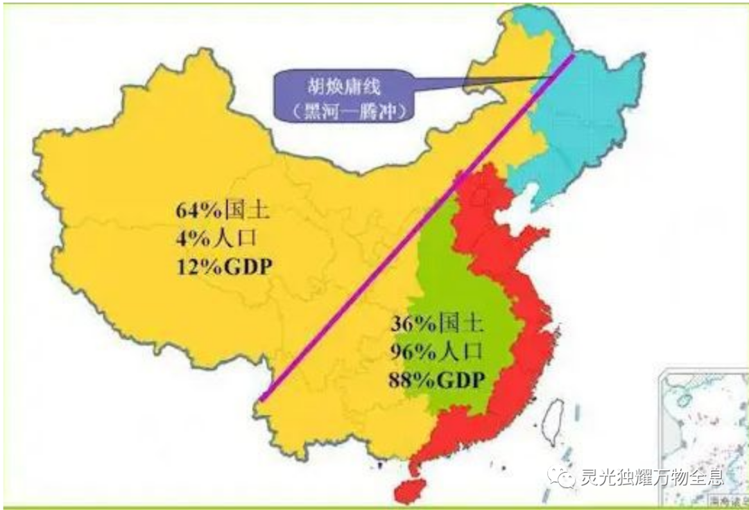 巧合的是,中国地理上有条大名鼎鼎的胡焕庸线(容易误打成胡惟庸线),是我国地理学家胡焕庸在八十多年前经调查统计而画出的一条地理线,如图: