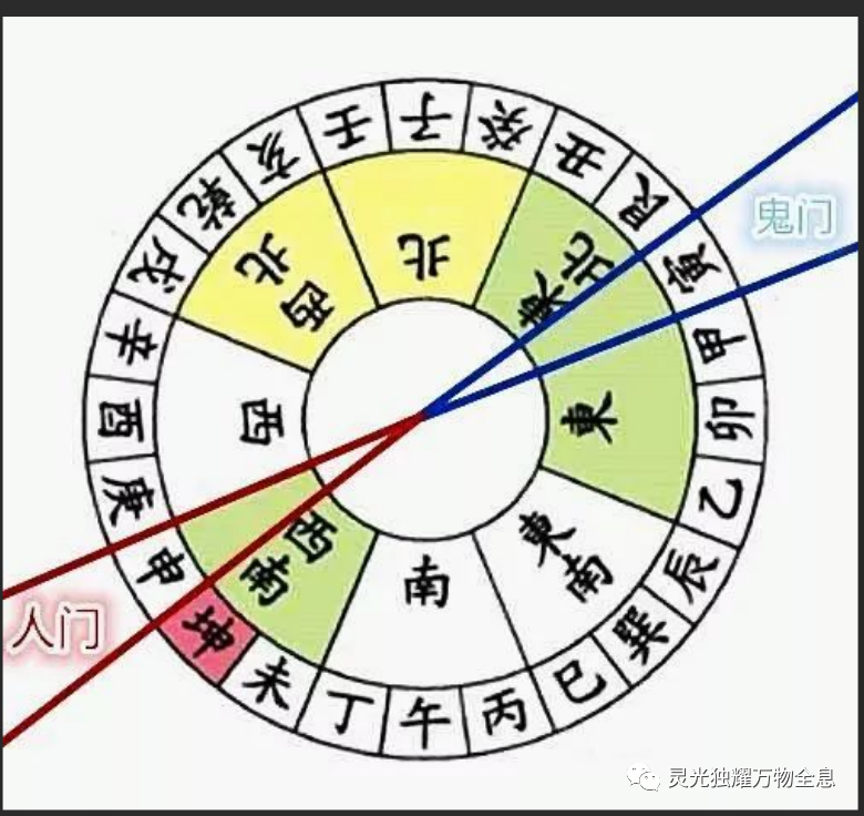 在易学、风水里,八卦九宫之下,有四道门、二条线,天门亥、地门巳一线,鬼门申、人门寅一线(也可以叫人门申、鬼门寅);天门亥,万物由此归藏亦由此孕育,地门巳,万物由此繁华盛放,人门寅,阴遁阳升,鬼隐人兴,鬼门申,阳衰阴盛,鬼出人退