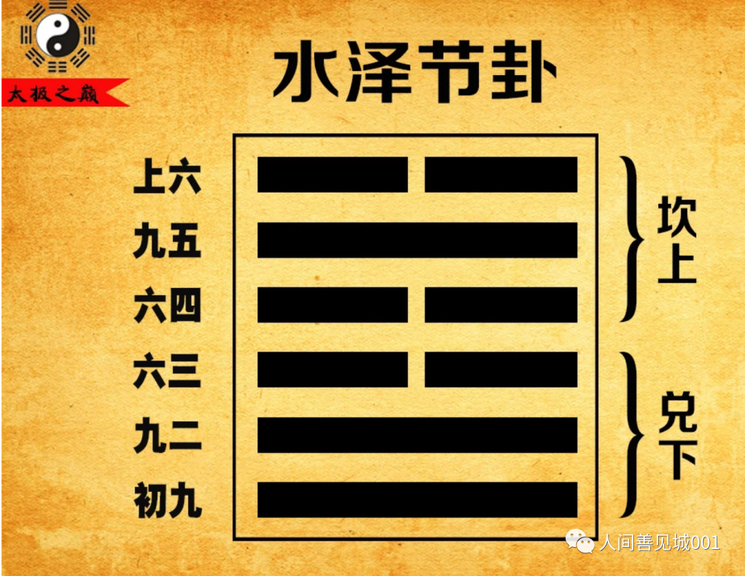 为何叫节?通俗大都解释为,上面是坎水,下面是兑泽,兑为悦而坎为险,这是告诉我们要居安思危、有节制,不要享乐太过而忘了头上的险水