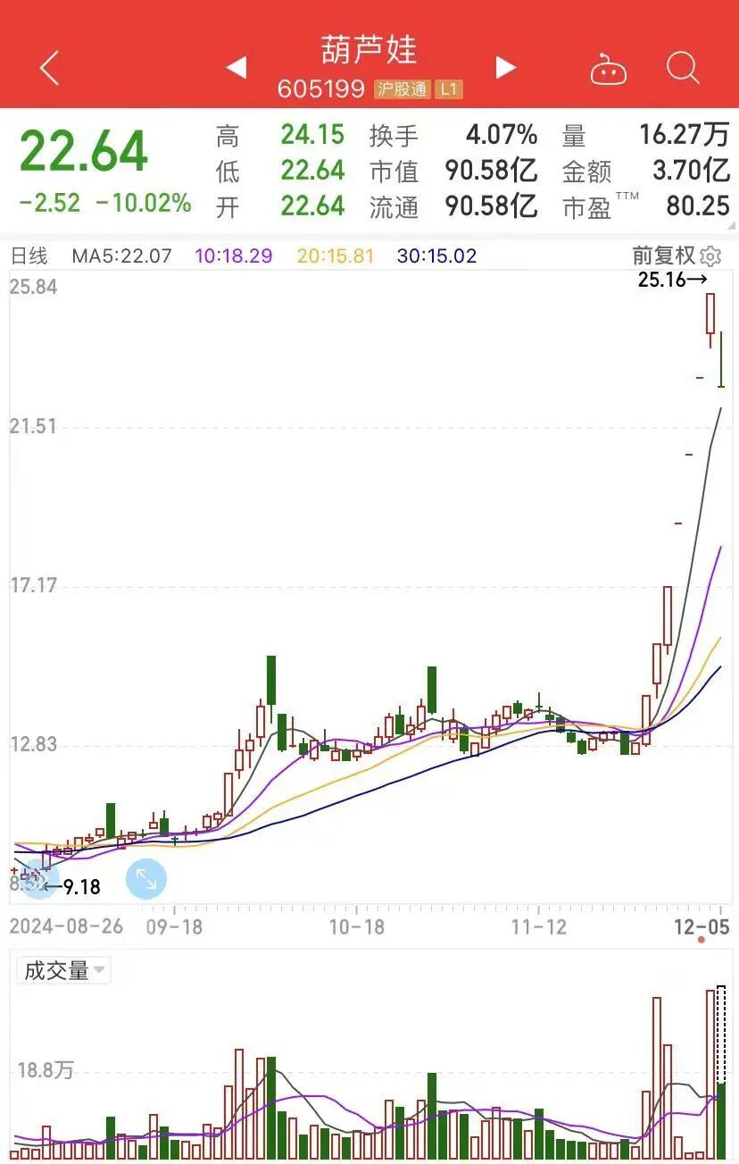 高位股开盘集体大跌,此前走出7连板的葫芦娃,今日开盘跳水跌停。桂发祥、漳州发展等近期热门股,在竞价阶段即跌停,上午保持跌停状态。此前录得12日9板的大东方,上午一字跌停;此前6连板的洪兴股份,上午闪崩跌停。