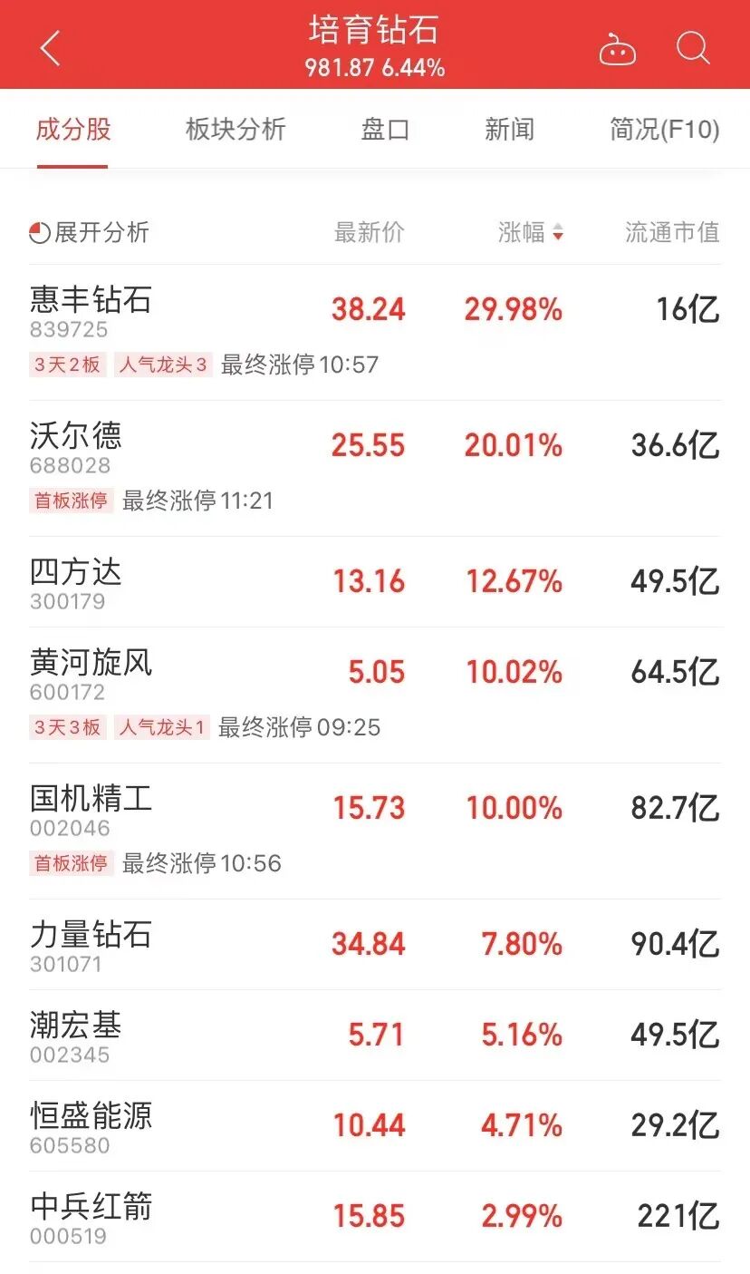 培育钻石概念股持续拉升,惠丰钻石、沃尔德双双涨停,黄河旋风、国机精工涨停。中信证券研报表示,近期国家加强对人造金刚石相关产品和技术的出口限制,凸显其战略属性,基本面角度看,培育钻石的市场在逐步扩大且应用场景不断拓展。