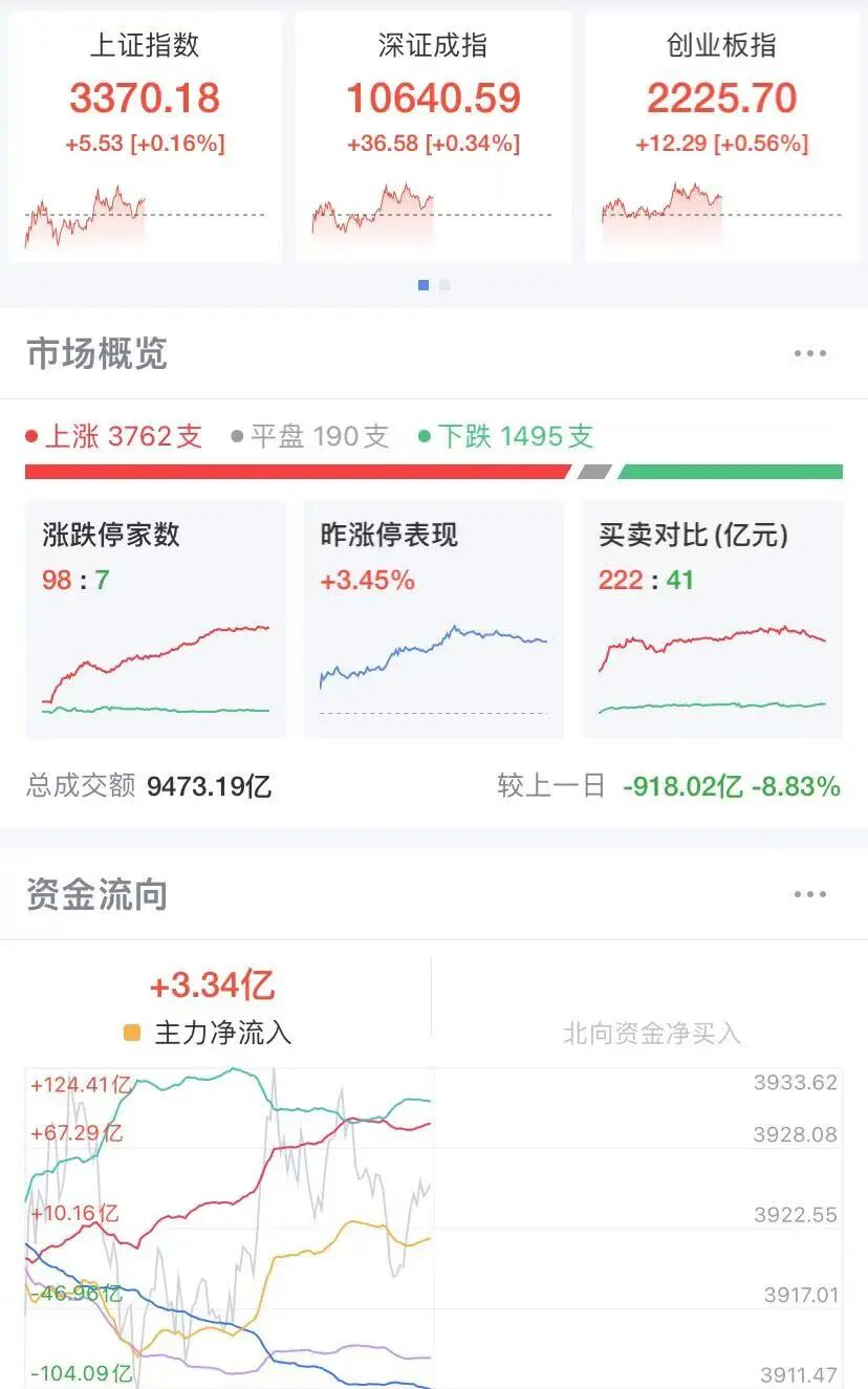 沪深京三市上涨个股3762只,涨停98只,下跌个股1495只,跌停7只。沪深京三市成交额9473亿元。