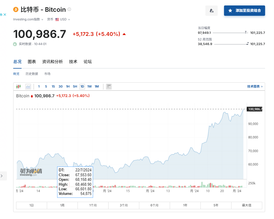 12月5日,比特币正式突破10万美元,日内上涨超5%,创历史新高。今年以来,比特币已经累计上涨近140%。