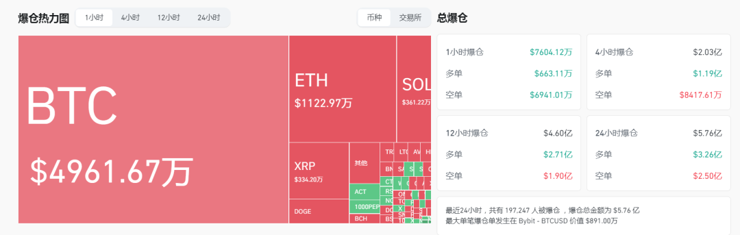 Coinglass数据显示,最近24小时,虚拟货币市场有超19万人爆仓 ,爆仓总金额为 5.76 亿美元。