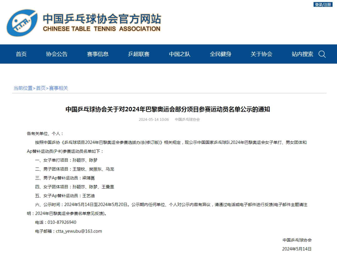 5月7日中国乒协率先公示了巴黎奥运会混双、男单项目参赛运动员。按照中国乒协《乒乓球项目2024年巴黎奥运会参赛选拔办法(修订版)》相关规定,根据2024年5月7日国际乒联公布的混合双打世界排名,王楚钦/孙颖莎以6780分的混双积分,位列世界排名第一,获得巴黎奥运会混双参赛资格。