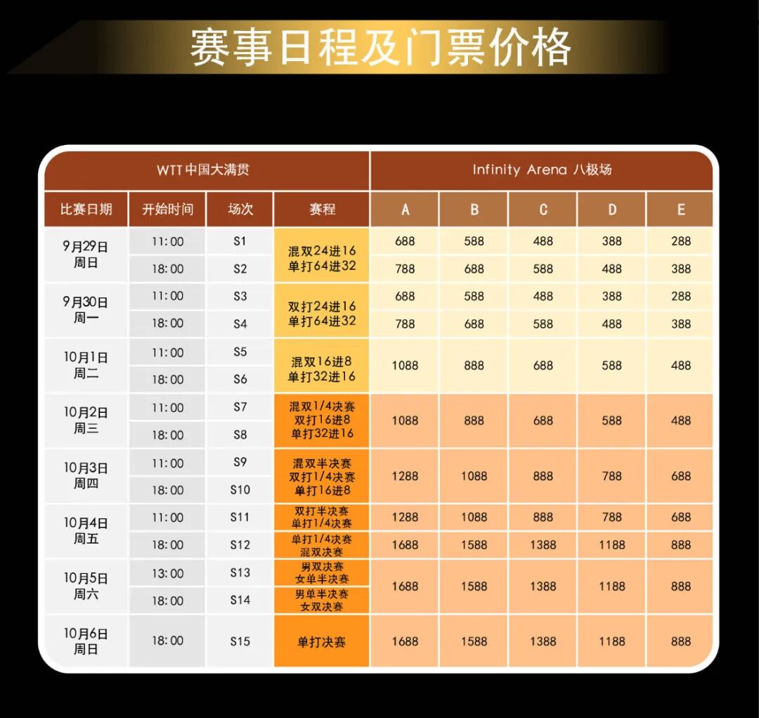 根据票务信息显示,本次赛事的白天场预计从上午11点开始,晚间场则会在18点开始。赛事初期票价为288元-788元之间,但到了混双决赛、男女双打决赛、单打决赛,票价则在至888元-1688元之间。