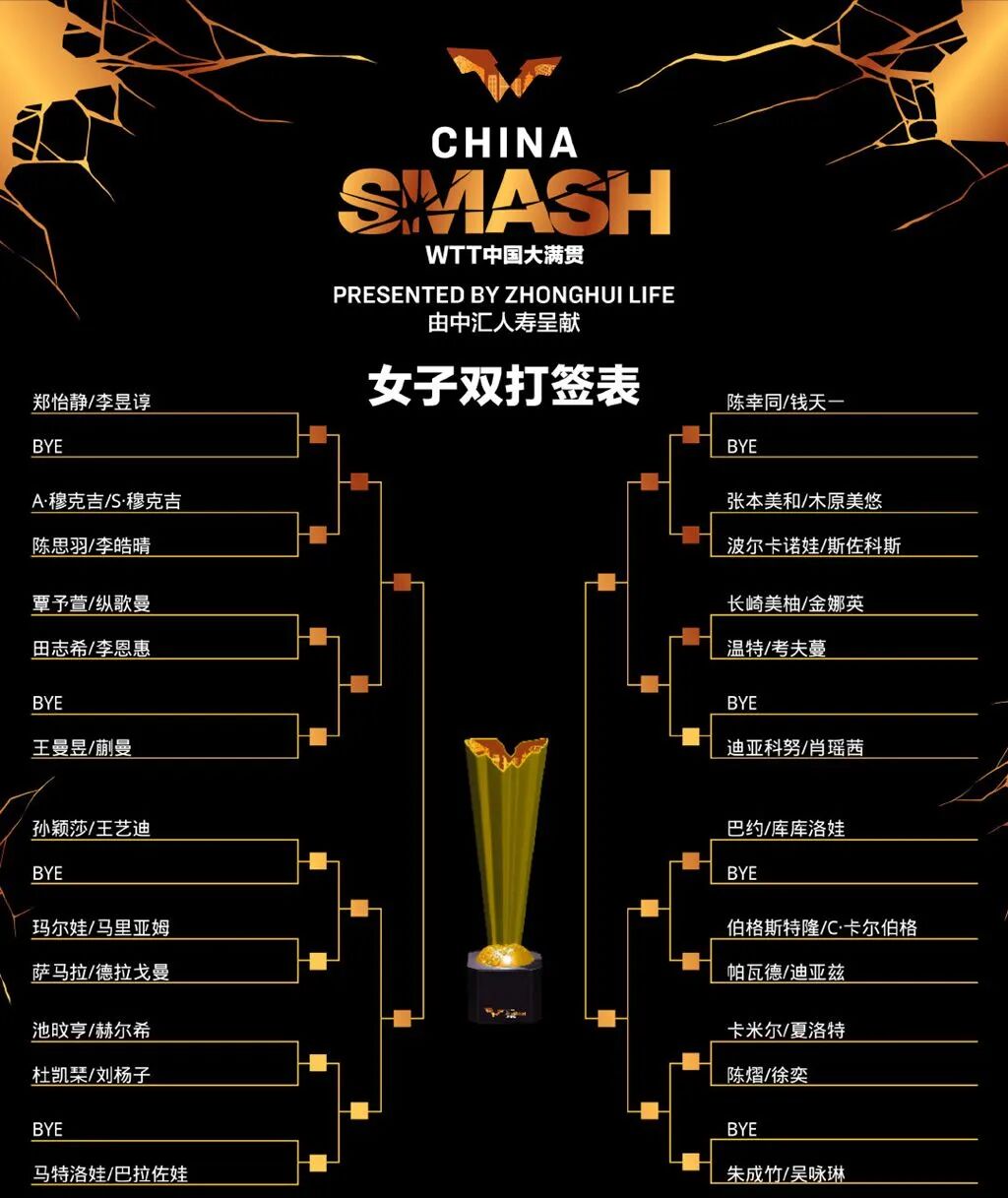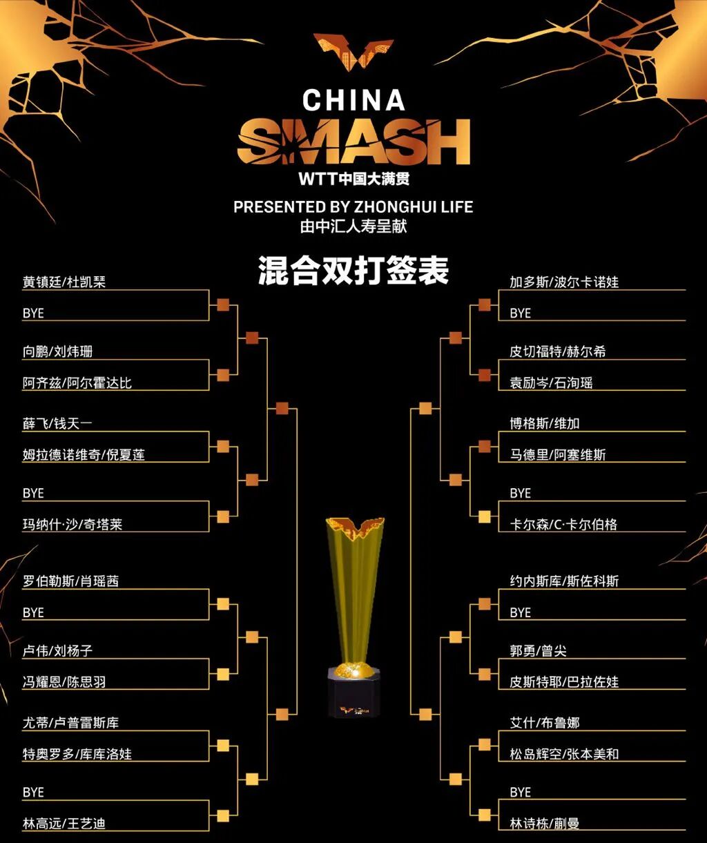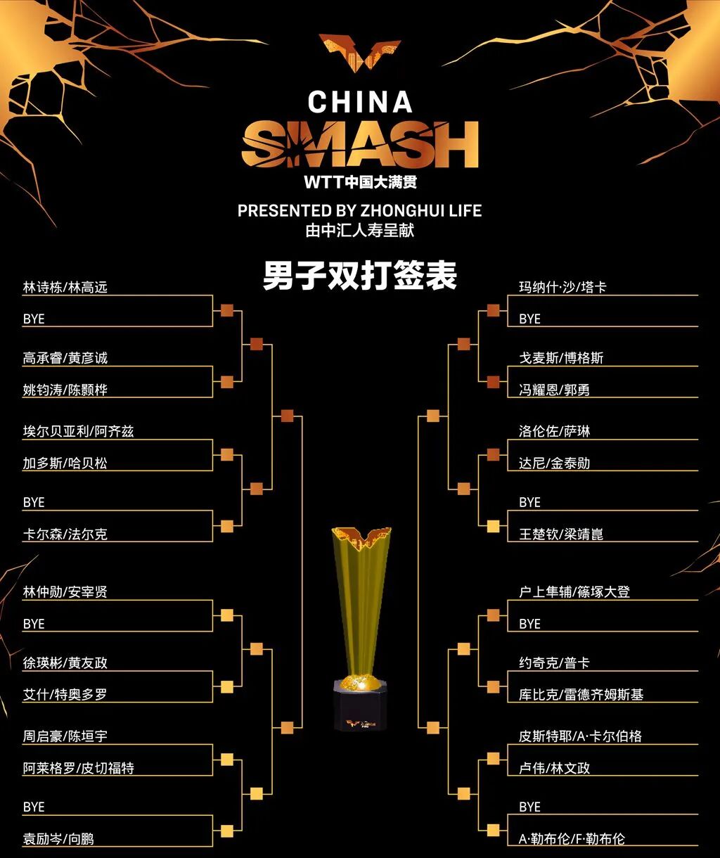 另外,WTT中国大满贯的男双、女双和混双签表结果也正式出炉。