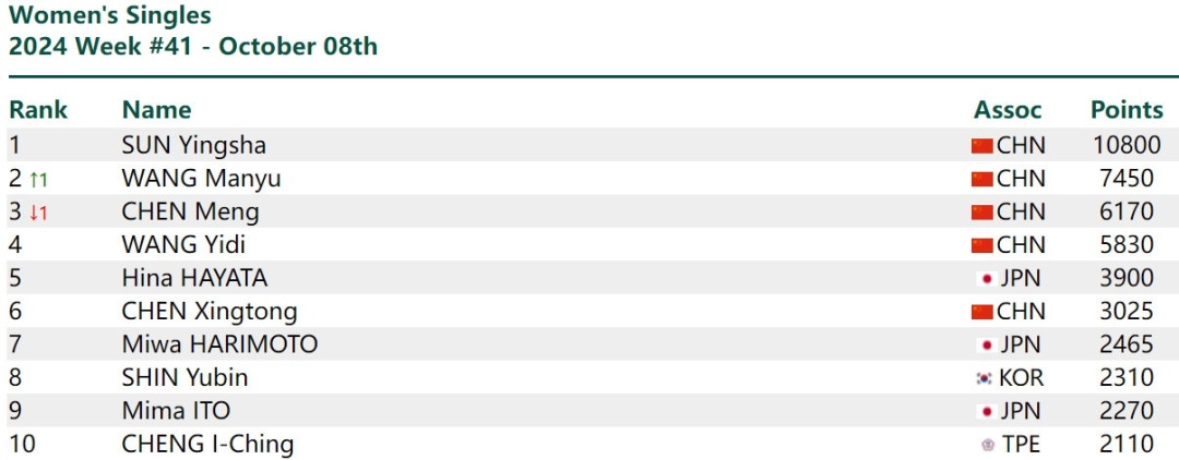 北京时间今天(8日),国际乒联更新了第41周排名,国乒在五个项目中继续领跑。尤为值得一提的是,刚刚在WTT中国大满贯女单夺冠的孙颖莎的积分已经来到了10800分,成为了世界排名新体系下首位积分破万的运动员。