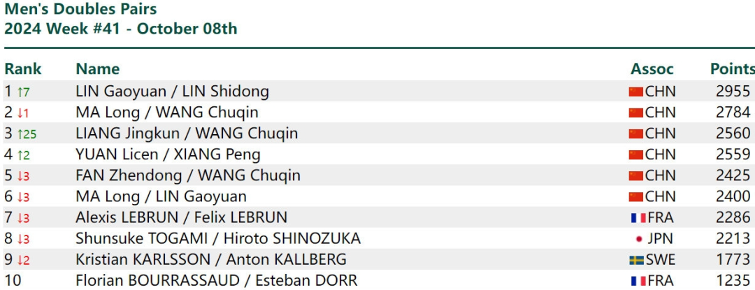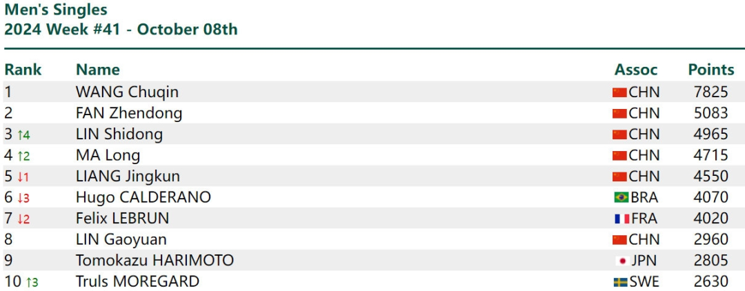 男单方面,王楚钦以7825分排名第一,樊振东5083分排名第二。刚刚在WTT中国大满贯男单决赛中4比3击败马龙的小将林诗栋排名上升4位来到第三名,积分为4965分。马龙和梁靖崑分别以4715分和4550分排名第四和第五。