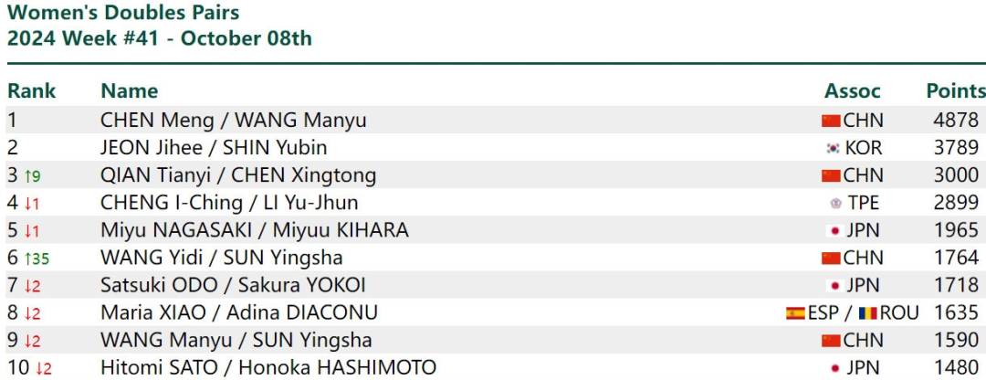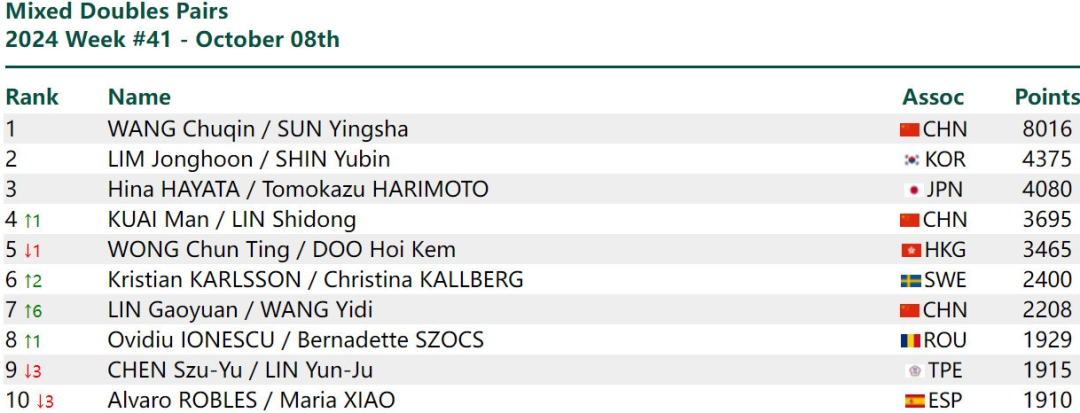 男双方面,林高远/林诗栋组合以2955分排名第一;女双方面,陈梦/王曼昱以4878分排名第一;混双方面,奥运冠军组合王楚钦/孙颖莎以8016分排名第一,遥遥领先,林诗栋/蒯曼组合排名也上升了一位,来到第四位。