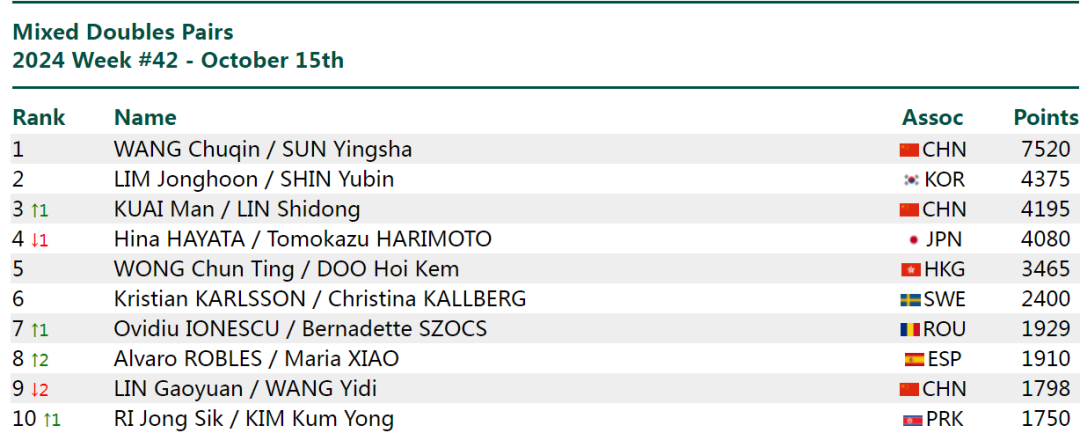 北京时间今天(15日)上午,国际乒联公布了2024年第42周世界排名,王楚钦和孙颖莎继续排名男单和女单的世界第一,林高远/林诗栋位列男双世界第一,陈梦/王曼昱位列女双世界第一,王楚钦/孙颖莎则位列混双世界第一。