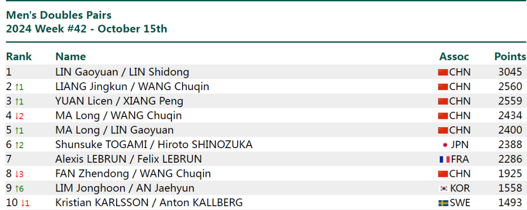 男子双打方面,前5名全部是中国组合,但是排位却有了不少变化。林高远/林诗栋以3045分继续排名世界第1位,梁靖崑/王楚钦上升1位来到世界第2位,袁励岑/向鹏同样上升1位来到世界第3位。