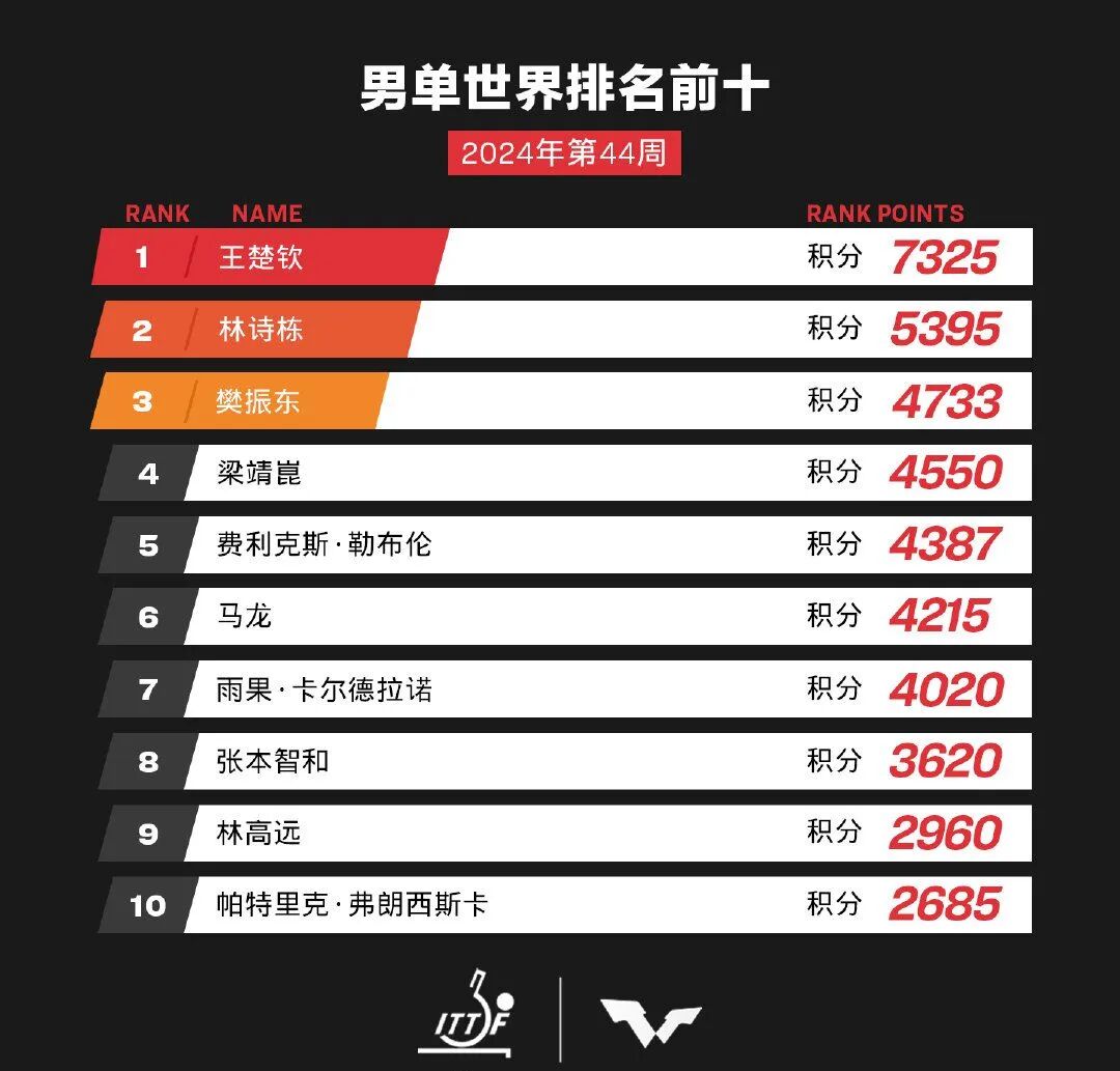 本周的世界排名根据上周日结束的WTT蒙彼利埃冠军赛结果稍有变动。男单方面,王楚钦、林诗栋、樊振东、梁靖崑依然位列前四,但在家乡夺得男单冠军的费利克斯·勒布伦排名上升两位来到第六,马龙下降一位到第五,巴西名将卡尔德拉诺下降一位到第七。