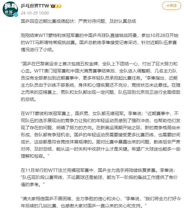 “国乒在巴黎奥运会上首次包揽五枚金牌,全队上下团结一心,付出了巨大努力和心血。WTT澳门冠军赛和中国大满贯赛事结束后,全队进入调整期,几名主力队员没有全部参加到近期赛事中,更多年轻队员承担起比赛任务。”