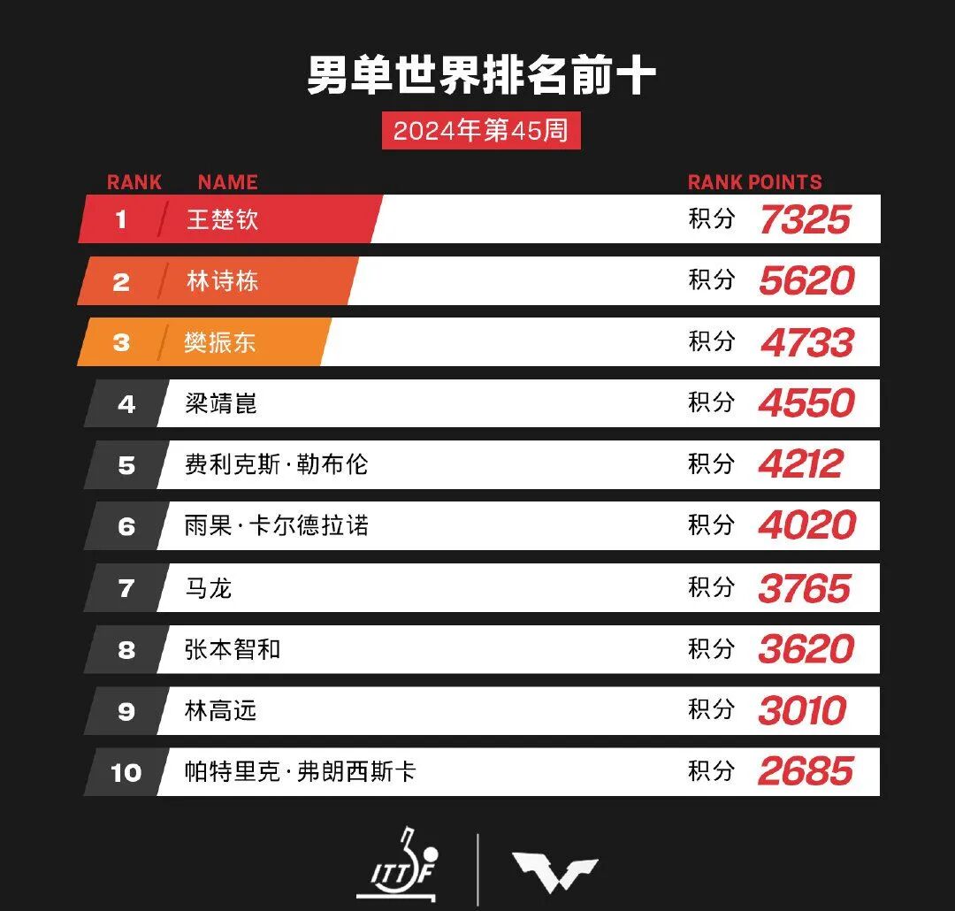 男子单打方面,中国球员王楚钦、林诗栋、樊振东和梁靖崑位列前四。其中,王楚钦的积分为7325分,继续稳居世界第1位。林诗栋以5620分排在第2位,樊振东以4733分排名第3位,梁靖崑以4550分排名第4位。另外,马龙的积分达到3765分,排名下降一位来到第7位。其他中国选手中,林高远排名第9位,向鹏排名第23位。