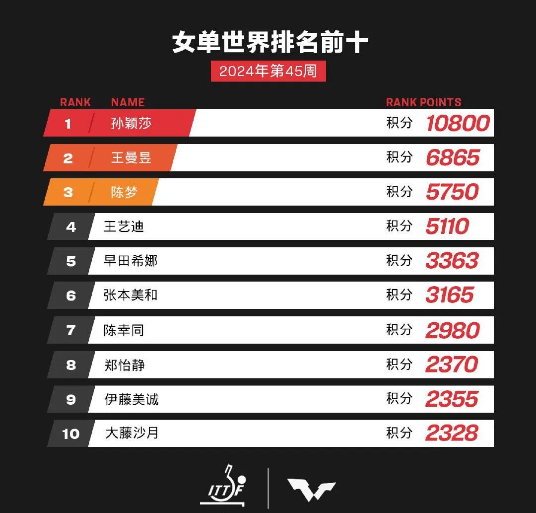 女子单打方面,中国球员孙颖莎、王曼昱、陈梦、王艺迪位列前四。其中,孙颖莎的积分高达10800分,依旧高居世界第1位。王曼昱以6865分位列第2位,陈梦的积分达到5750分,王艺迪的积分达到5110分。另外,陈幸同位列第7位,她的积分达到2980分。