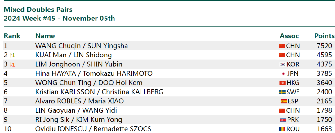 混合双打方面,王楚钦/孙颖莎强势领跑排名榜单,他们的积分高达7520分。排在第2位的是蒯曼/林诗栋,他们比上一期上升了1个名次。排名下降一位的则是韩国组合林仲勋/申裕斌。