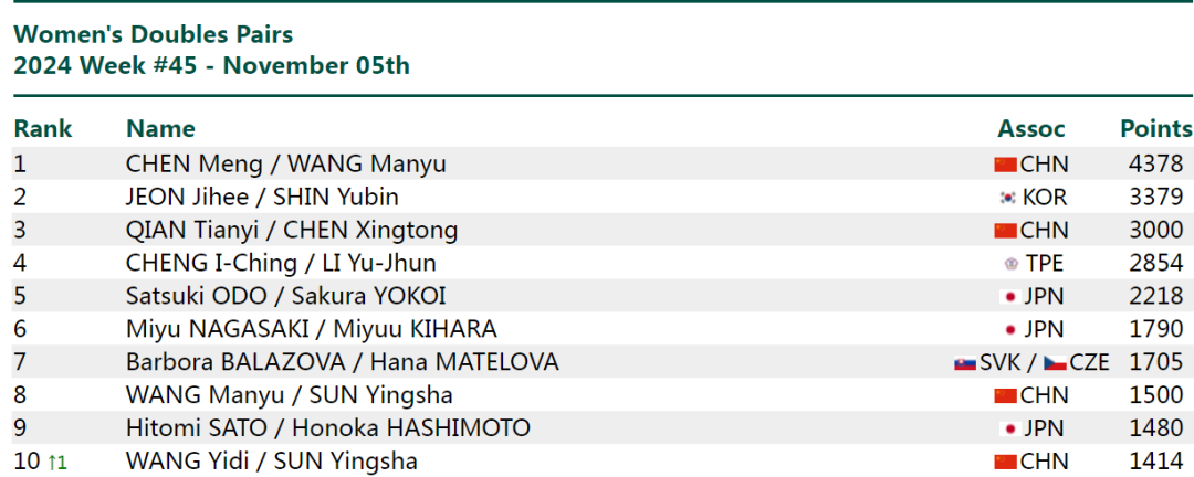 女子双打方面,前几位的排名没有发生变化,陈梦/王曼昱继续稳居世界第1位,她们的积分为4378分。田志希/申裕斌以3379分排名第2位,另一对中国组合钱天一/陈幸同以3000积分排名第3位。