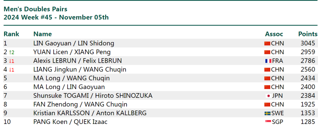男子双打方面,前6位中有5对中国组合。林高远/林诗栋以3045分继续排名世界第1位,袁励岑/向鹏的排名上升了2个名次,来到世界第2位。勒布伦兄弟则排名第3位。