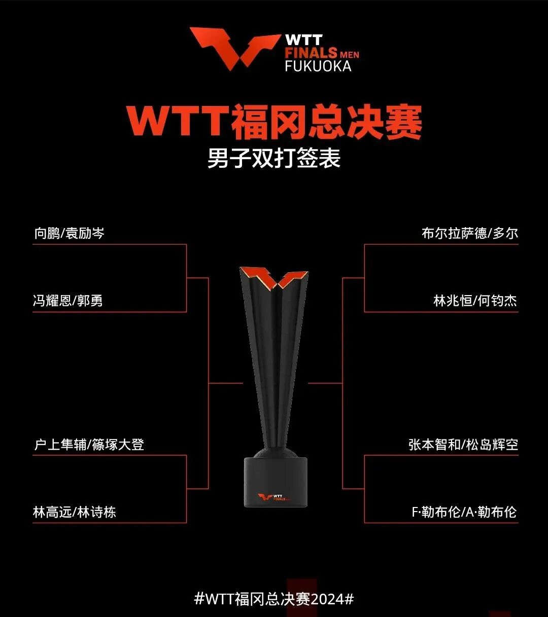 男双国乒两对组合都在上半区,向鹏/袁励岑和林高远/林诗栋首轮分别迎战新加坡组合冯耀恩/郭勇和日本组合户上隼辅/篠塚大登,胜者在决赛很可能遭遇到勒布伦兄弟的挑战。