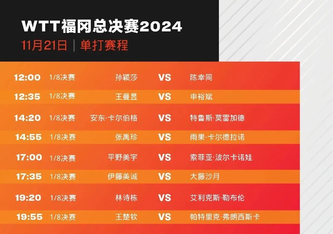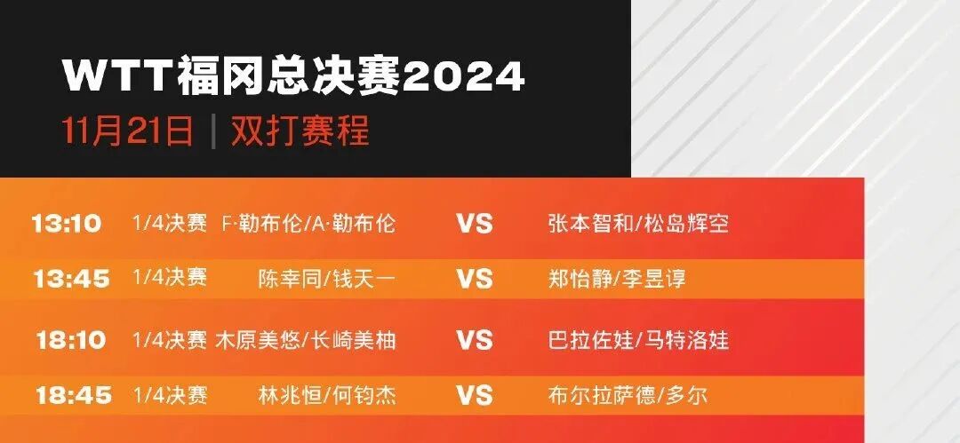随后王曼昱也将出战女单1/8决赛,她的对手是韩国选手申裕斌。13点45分,陈幸同/钱天一将出战女双1/4决赛,对手是中国台北组合郑怡静/李昱谆。晚间,19点20分,林诗栋将出战男单1/8决赛,对手是艾利克斯·勒布伦。19点55分,王楚钦将出战男单1/8决赛,对手是帕特里克·弗朗西斯卡。希望各位在今天能够有好的表现。