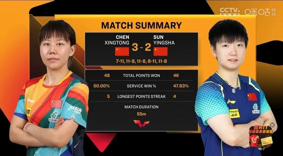 首局比赛,孙颖莎11比7先下一城,但随后陈幸同连续两局以11比8的比分获胜实现反超,关键的第四局,孙颖莎抓住机会11比8拿下比赛,将大比分扳成了2比2平。决胜局,两人打得颇为激烈,最终陈幸同11比8力克孙颖莎,大比分3比2获胜晋级八强,她下一轮的对手将会是波尔卡诺娃和平野美宇之间的胜者。值得一提的是,在昨天的女双比赛中,孙颖莎/王艺迪组合1比3不敌日本组合佐藤瞳/桥本帆乃香,无缘半决赛。因此在单打也出局后,孙颖莎已经告别了本届总决赛。