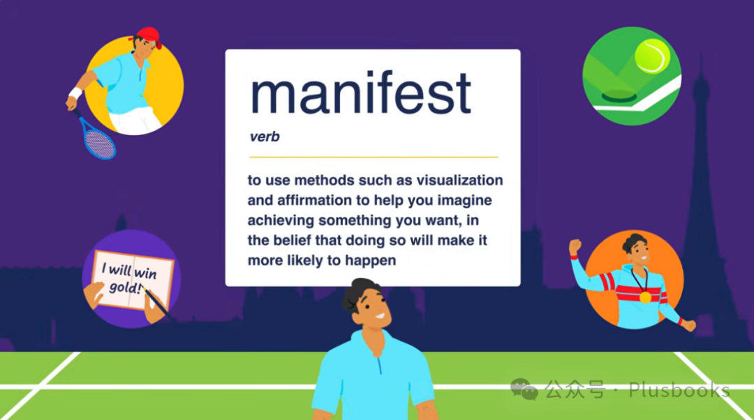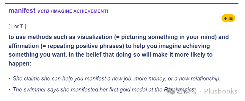剑桥词典在公布年度词汇manifest时,给出的一种新的英文解释为: to use methods such as visualization and affirmation to help you imagine achieving something you want, in the belief that doing so will make it more likely to happen。