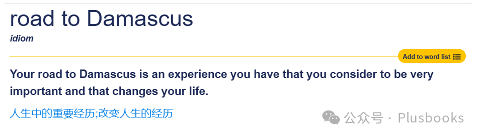 剑桥词典的释义为 Your road to Damascus is an experience you have that you consider to be very important and that changes your life. “人生中的重要经历,改变人生的经历”。