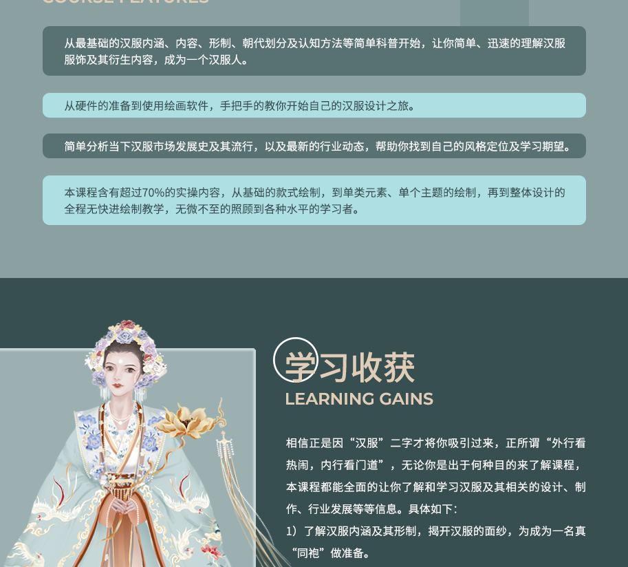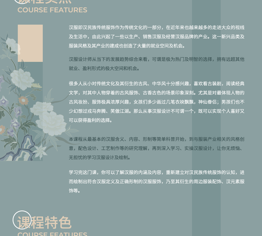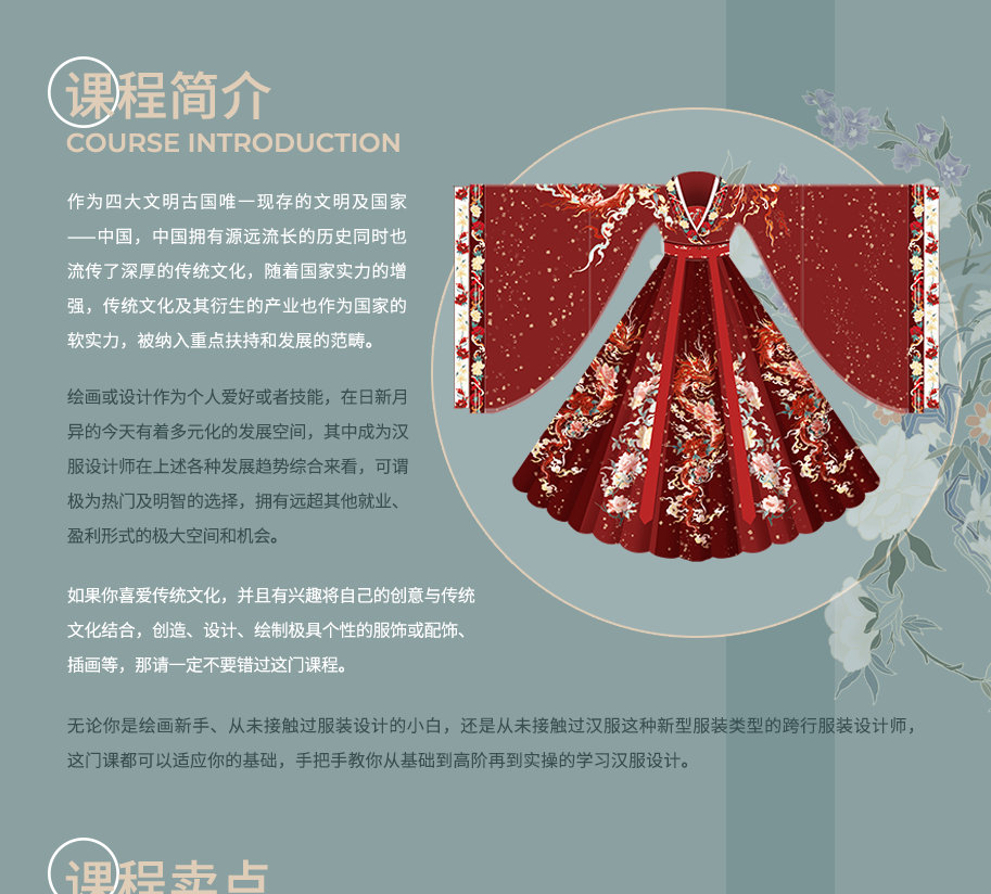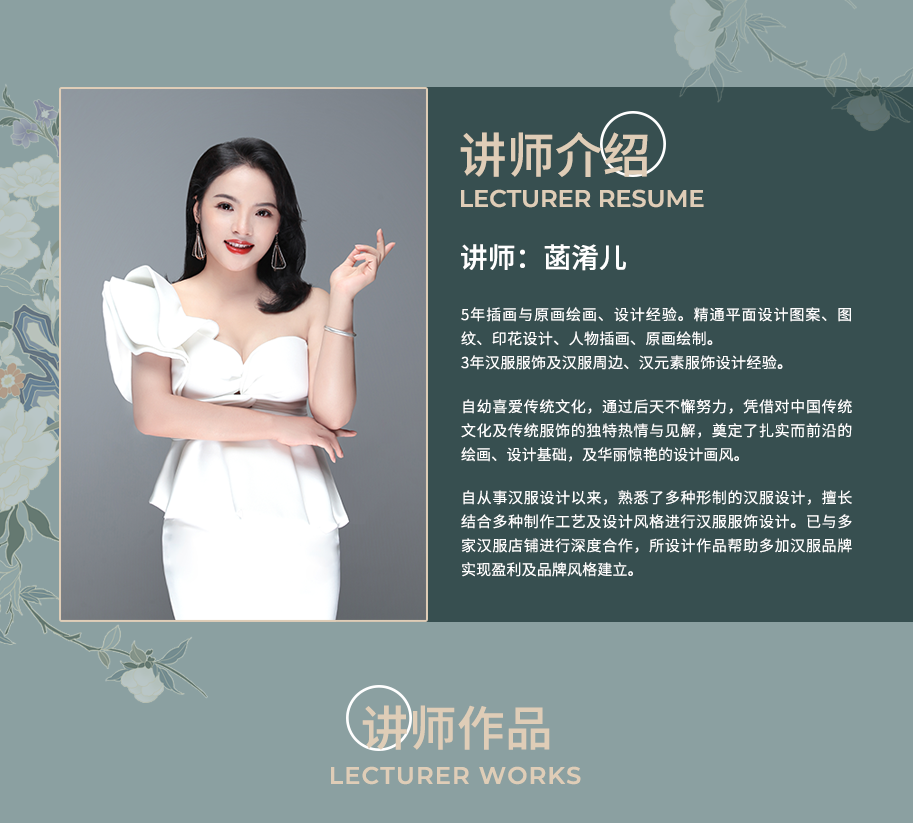 无论你是绘画新手、从未接触过服装设计的小白,还是从未接触过汉服这种新型服装类型的跨行服装设计师,这门课都可以适应你的基础,手把手教你从基础到高阶再到实操的学习汉服设计。只要你愿意花时间和精力以及一些些耐心,学习完这门课,相信你一定能设计出具有你个人特色的美丽汉服。的美丽汉服。关键词:汉服、PS、设计、绘画、花纹....