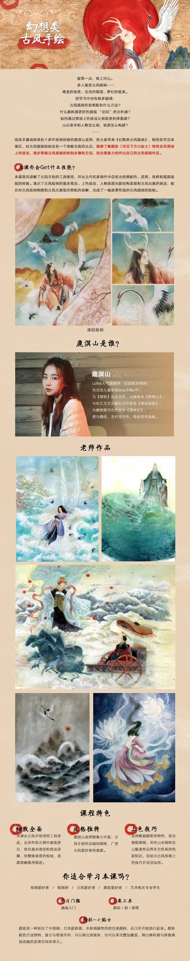 本课首先讲解了古风手绘的工具使用,并从古代名家画作中总结出经典配色、造型、纹样和氛围表现的经验。演示了古风绘画的基本笔法、上色技法、人物面部光影结构表现和古风元素的画法;配合对古风绘画构图和古风元素组合搭配的讲解,完成了一幅故事性强的古风插画的绘制。