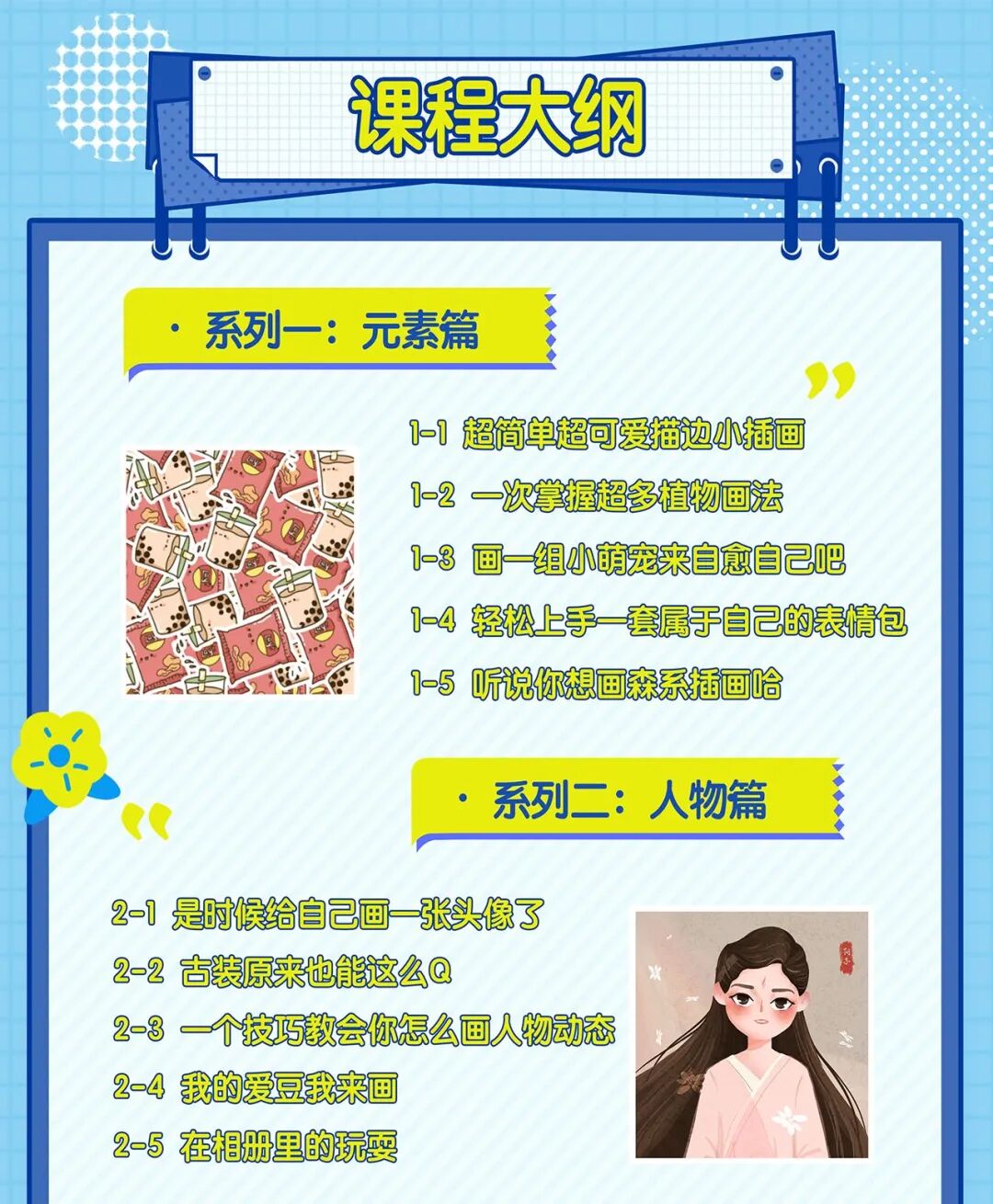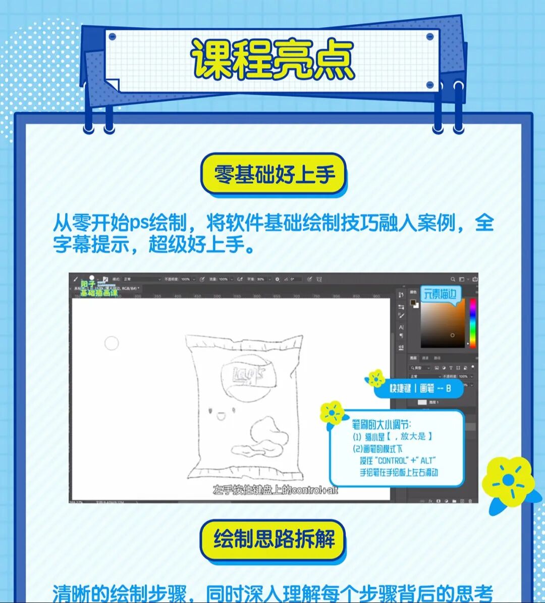 ps插画零基础必备,15个保姆级案例代练,从零开始阶段性升级,一一攻克软件绘画使用技巧、清晰了解的绘制步骤,深入理解创作思路,快速掌握线描和森系两种风格,并且让插画融入生活,创作属于自己的插画周边衍品