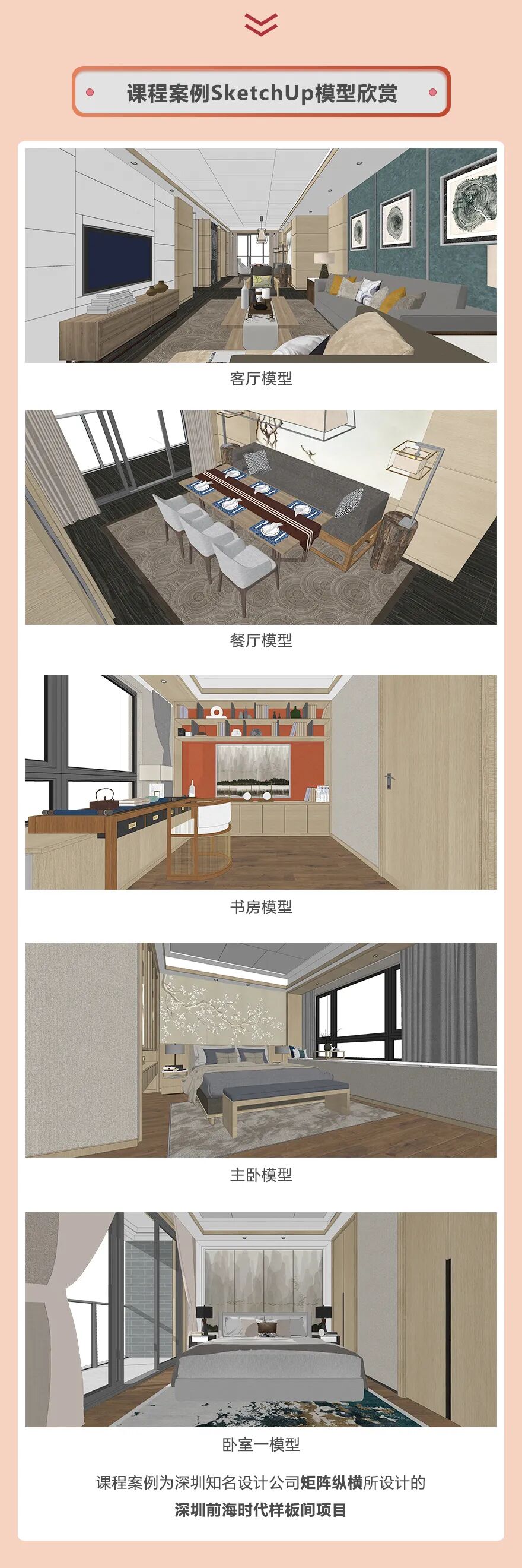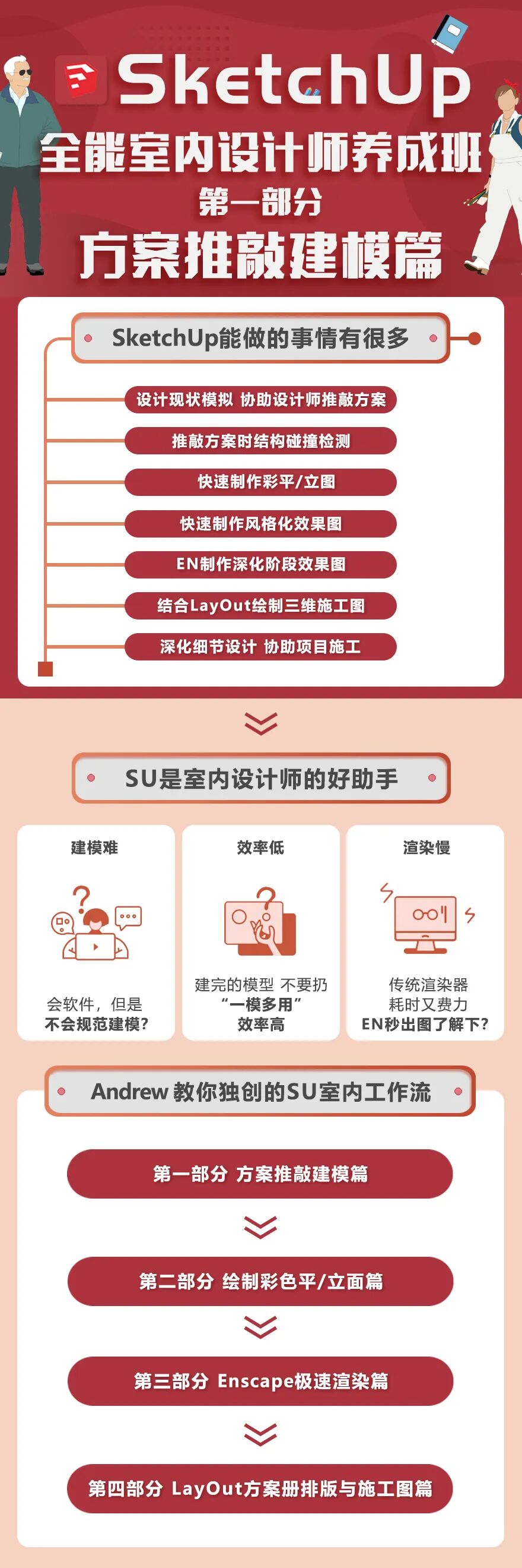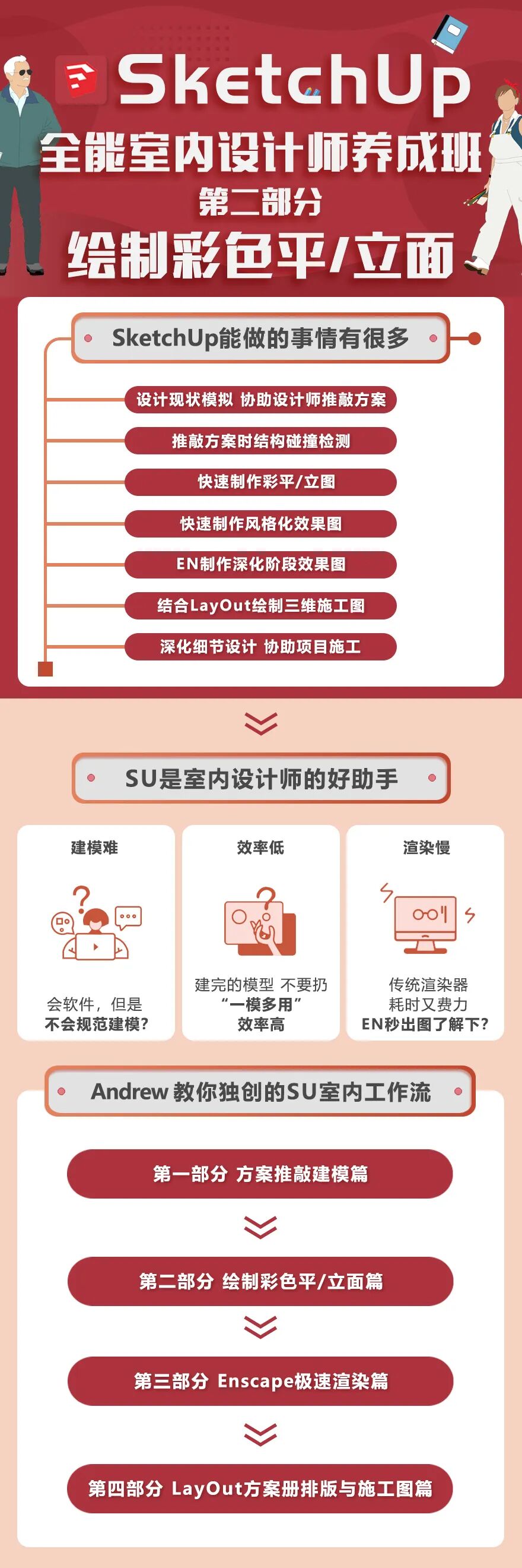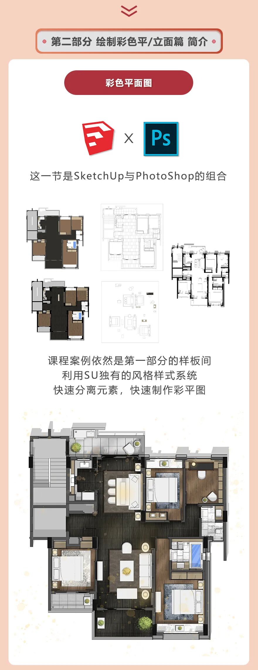 本课程主要讲利用SU+PS快速绘制更具艺术化的彩色平/立面图、天花灯具点位图,用于汇报方案使用。