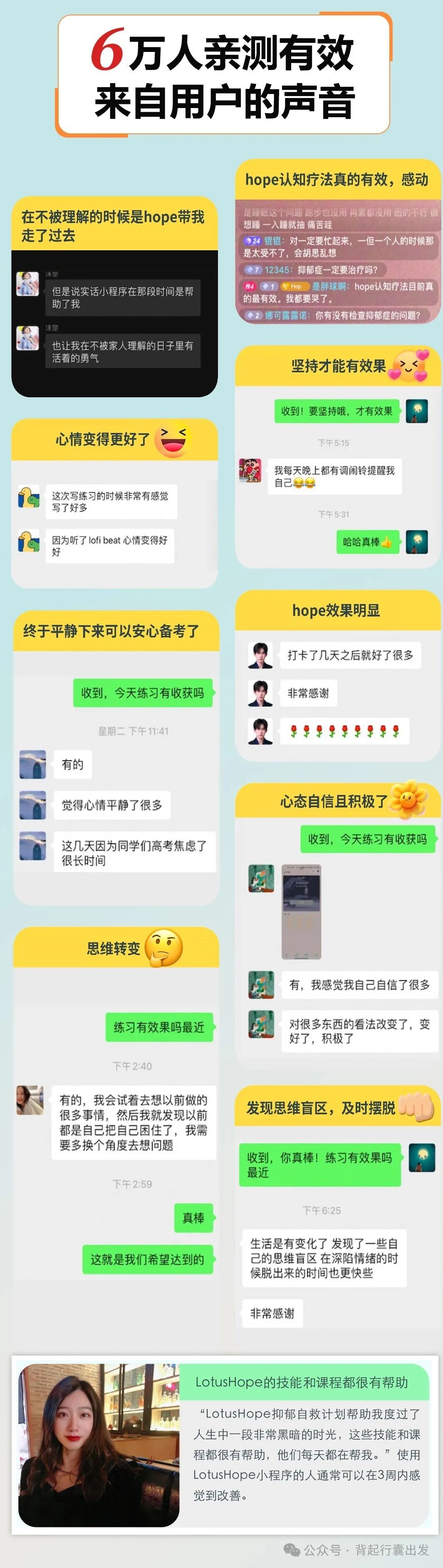 目前,已经有6W多名用户参加过「Hope40天抑郁自救计划」,积累了上万份疗效数据。并且会有专业人士和团队专家定期为小伙伴们答疑解惑。