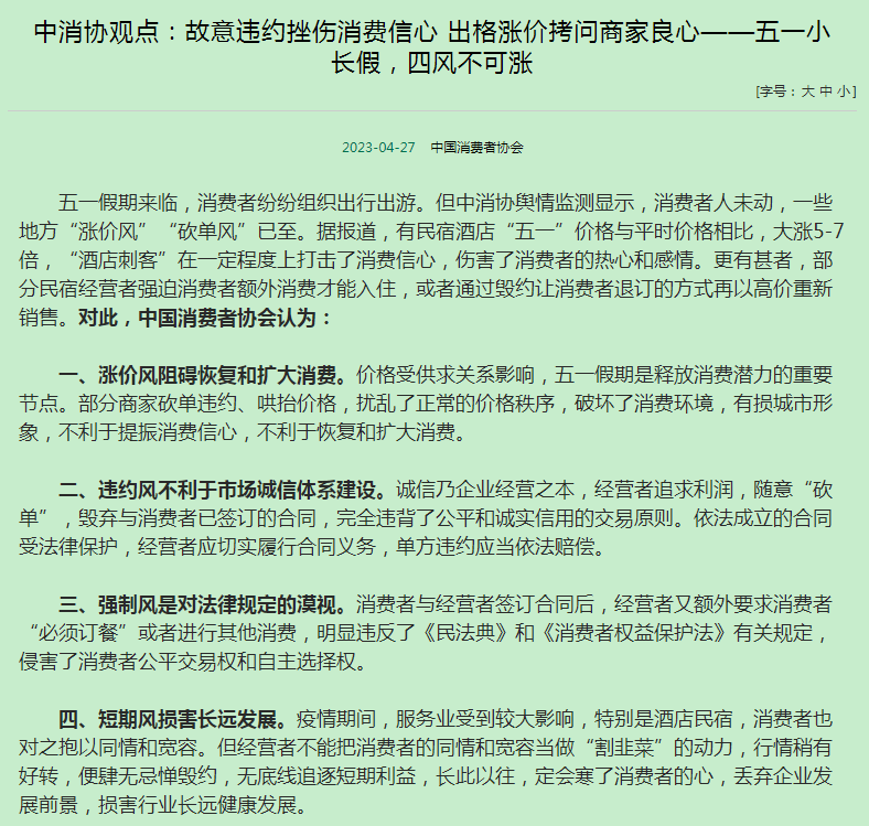 提振消费信心,靠的是诚信经营、品质服务。期待各地酒店经营者能提高守法意识,自觉摒弃坐地起价、强制消费、随意毁约、串通涨价等花式套路,以合法、诚信经营积累良好口碑。也希望各地管理部门能采取有效措施,做好提示预警和预期管理,以切实维护好假期市场价格秩序。少一些任性涨价,多一些优质服务,才能稳稳接住流量,让消费者没有后顾之忧敢消费、消费环境优获得感强愿消费。