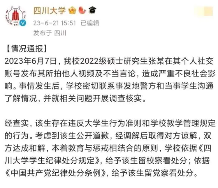 不久前,四川大学依规依纪给予该校硕士研究生张某留校察看、留党察看处分,闹得沸沸扬扬的地铁所谓“偷拍”事件暂时告一段落。但日前,北京一家律师事务所与上海一影视传媒公司负责人相继宣布拒聘四川大学毕业生,再次引发社会关注。