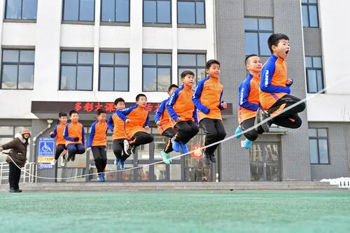 山东省烟台市,小学生在玩跳绳游戏。孙文潭 摄(影像中国)