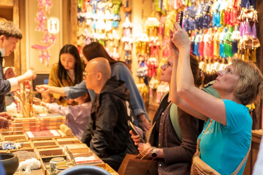 上海豫园商城内,外国游客被香囊吸引。王初摄(影像中国)