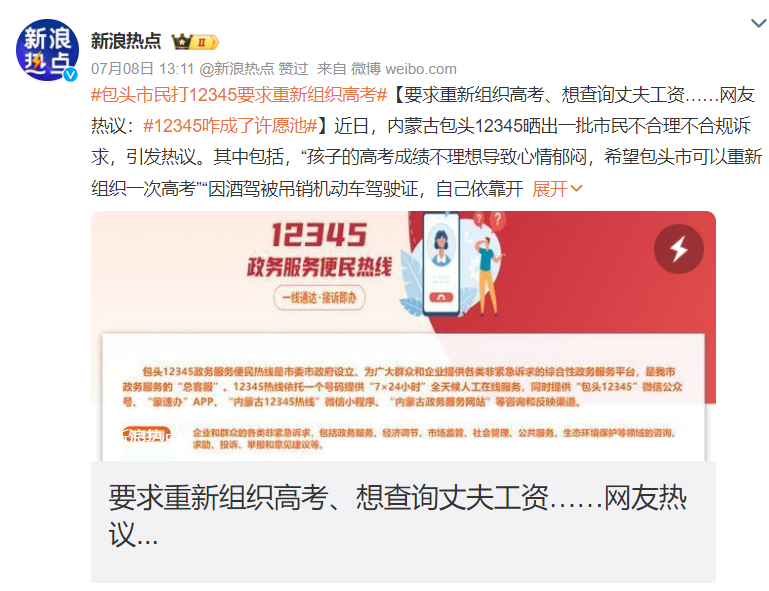 成绩不理想导致心情郁闷,希望重新组织一次高考;家住6楼出行不便,希望政府收购房屋后置换较低楼层;希望查询丈夫的工资发放时间以及明细……一些地方的12345便民热线晒出一批“超纲越界诉求集锦”,令网友忍俊不禁,直呼“话务员是怎么忍住不笑的”。