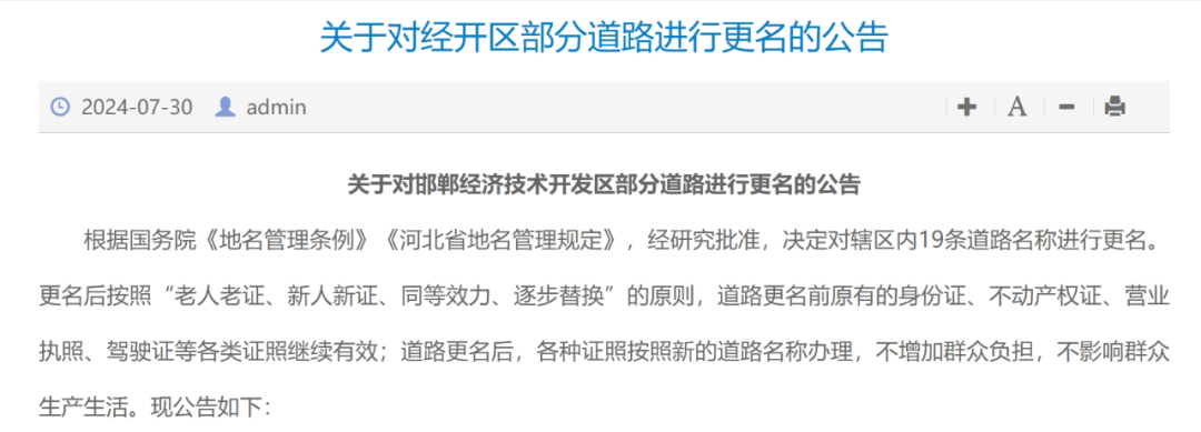 7月30日,河北邯郸经济技术开发区社会事务局发布一则公告,称将对区域内十多条以成语命名的道路予以更名。这些道路包括“一言九鼎街”“志在四方街”“胡服骑射路”“脱颖而出路”“青出于蓝街”“完璧归赵路”等,这些“成语街道”更名的原因均为“不易识记道路”。