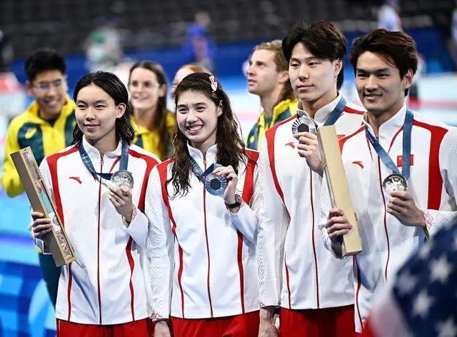 杨浚瑄、张雨霏、覃海洋、徐嘉余(从左至右)在男女混合4×100米混合泳接力比赛中摘得银牌,以3分37秒55的成绩打破亚洲纪录。新华社记者王鹏 摄
