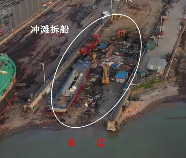 2022年3月28日,督察组现场督察发现,江苏复兴船舶有限公司冲滩拆船,废机油等危险废物随意抛撒倾倒在江滩上。(督察组供图)