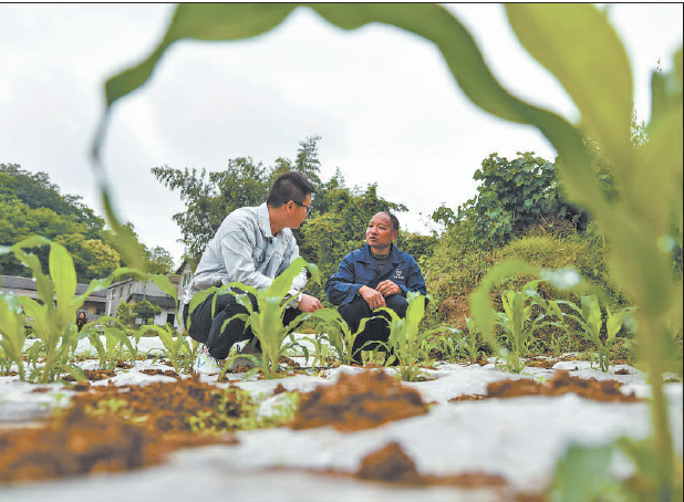 图为5 月1 日,西部计划志愿者文荣华(左)在贵州省遵义市红花岗区南关街道金华村玉米种植基地与村民交流。罗星汉摄(人民视觉)