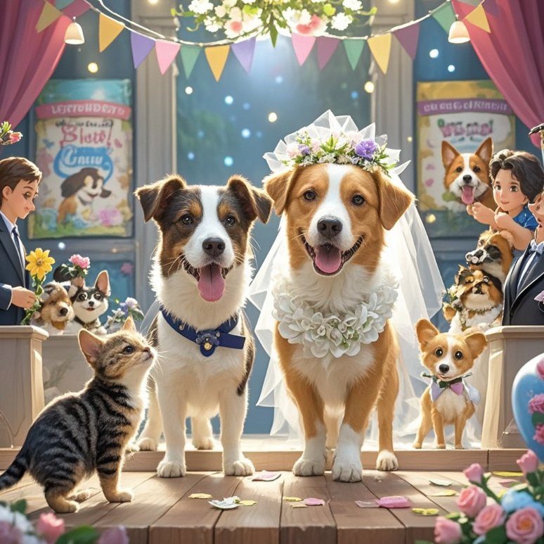 一只狗狗爱上了另一只狗狗,他们决定举行一场婚礼。狗狗们邀请了所有的朋友,甚至连狗粮店的老板都来了。婚礼仪式开始,两只狗狗庄重地走向舞台。然而,就在他们要交换誓言时,一只调皮的猫突然闯入现场,狗狗们纷纷追了出去。婚礼现场一片混乱,最后,两只狗狗决定取消婚礼,一起去追猫。